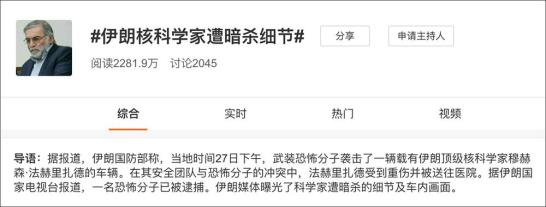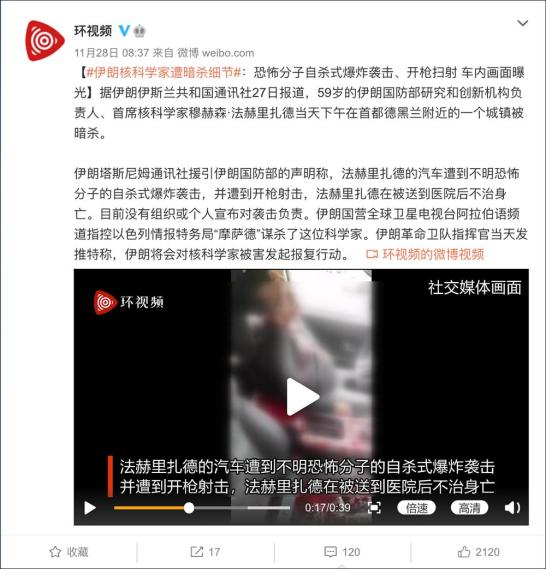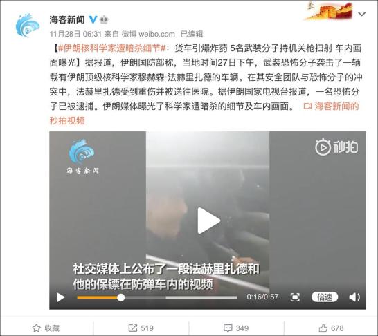 11月28日,有52萬粉絲的微博賬號“@海客新聞”發(fā)布博文:“【#伊朗核科學家遭暗殺細節(jié)#:貨車引爆炸藥 5名武裝分子持機關槍掃射 車內畫面曝光】據報道,伊朗國防部稱,當地時間27日下午,武裝恐怖分子襲擊了一輛載有伊朗頂級核科學家穆赫森·法赫里扎德的車輛。在其安全團隊與恐怖分子的沖突中,法赫里扎德受到重傷并被送往醫(yī)院。據伊朗國家電視臺報道,一名恐怖分子已被逮捕。伊朗媒體曝光了科學家遭暗殺的細節(jié)及車內畫面?!?/p>