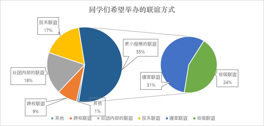 周報(bào)的調(diào)查數(shù)據(jù)顯示,更多人期待小規(guī)模聯(lián)誼活動(dòng):24%的同學(xué)希望組織班級(jí)聯(lián)誼,而贊成寢室聯(lián)誼這一方式的同學(xué)則占到了30%以上。這表明聯(lián)誼仍有路可循。