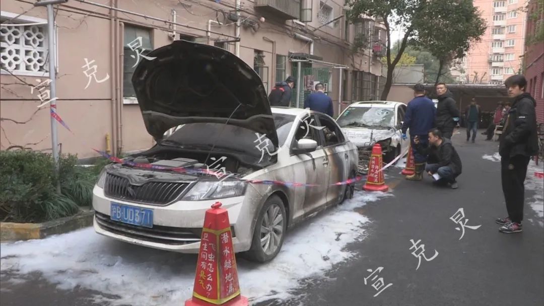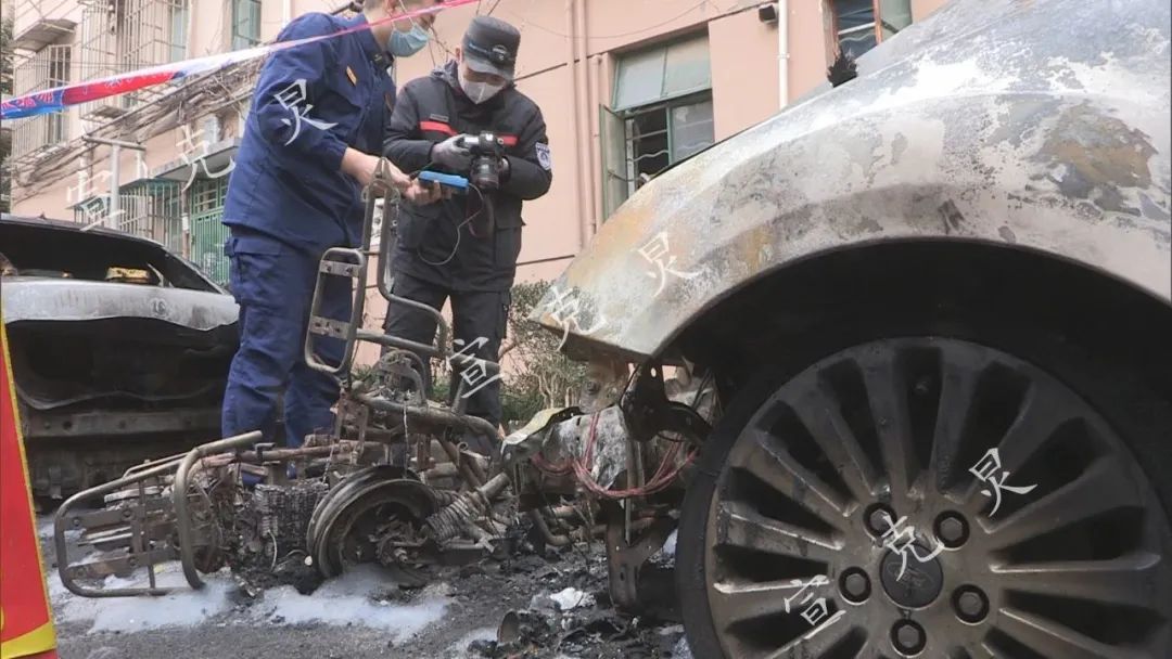 但兩輛轎車幾乎已經(jīng)被燒報廢了,車窗碎裂、車內(nèi)物件被燒熔,兩輛非機動車則燒剩下一個框架。