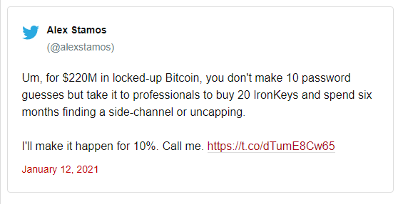 在托馬斯對外提到自己困境后,斯坦福互聯(lián)網(wǎng)觀察實(shí)驗(yàn)室的網(wǎng)絡(luò)安全專家亞歷克斯·斯塔莫斯在推特上發(fā)文表示,自己可以在6個月內(nèi)破解密碼,但要收取這批比特幣總價(jià)的10%作為酬勞。