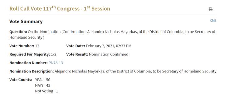 參議院當(dāng)天以56票贊成、43票反對的表決結(jié)果,批準(zhǔn)61歲的古巴裔美國人馬約卡斯出任國土安全部長。(下圖為參議院投票結(jié)果,其中56票贊成,43票反對,1票棄權(quán))。