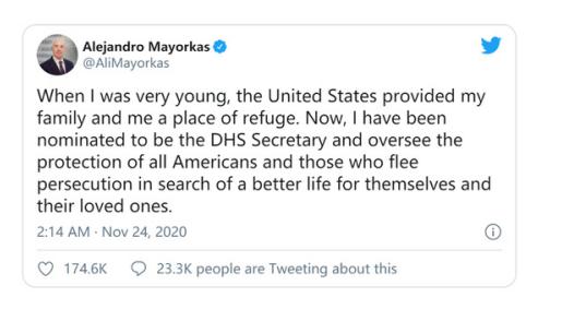 11月24日凌晨,亞歷杭德羅·馬約卡斯(Alejandro Mayorkas)在自己的推特上如是寫道。