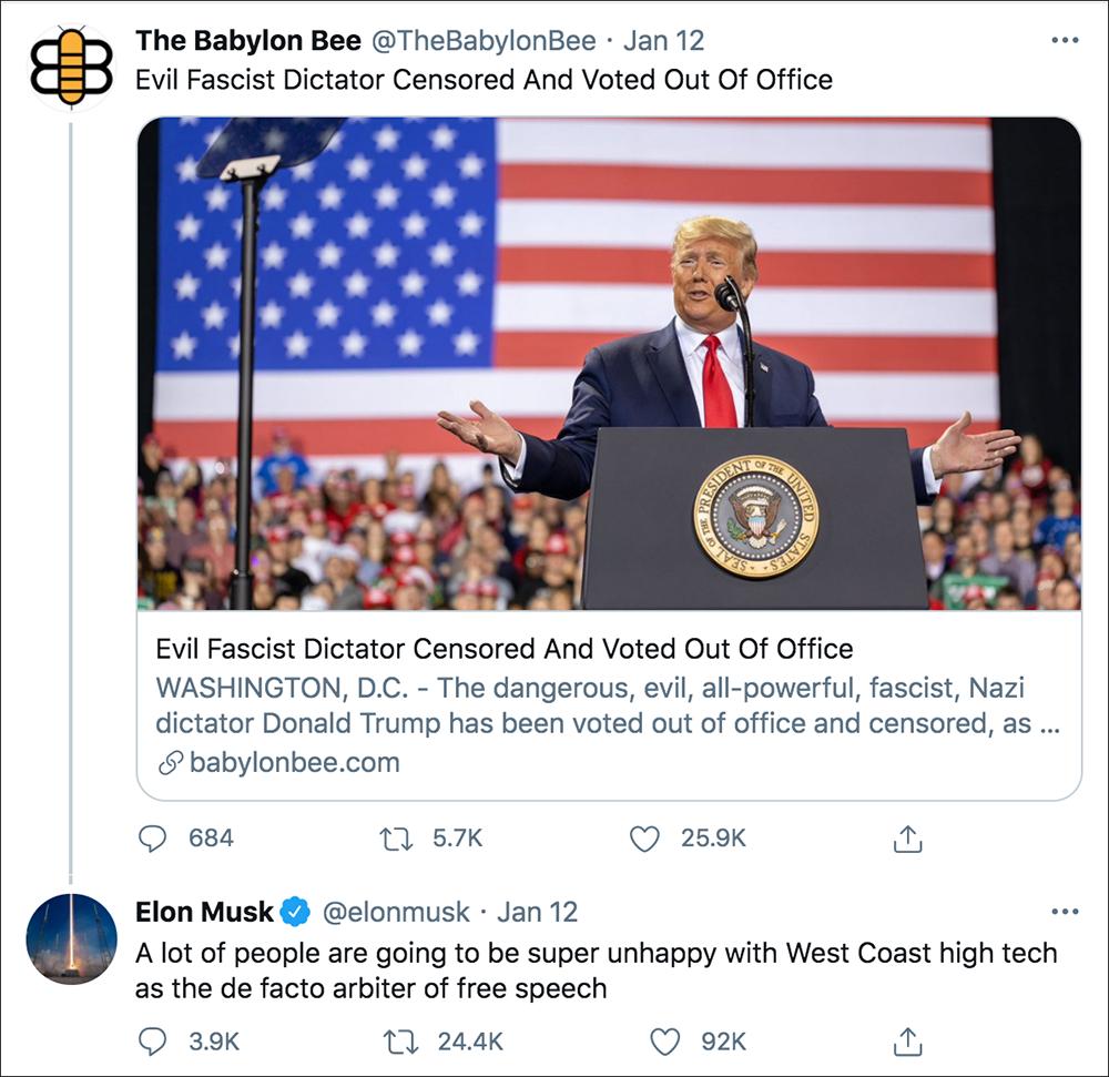1月12日,馬斯克轉發(fā)了諷刺新聞網(wǎng)站The Babylon Bee發(fā)表的一篇調(diào)侃特朗普社交媒體賬號被封的文章,同時表示:“很多人將會對西海岸的這些科技公司成為實際的言論自由仲裁者而感到超級不爽(A lot of people are going to be super unhappy with West Coast high tech as the de facto arbiter of free speech)。”