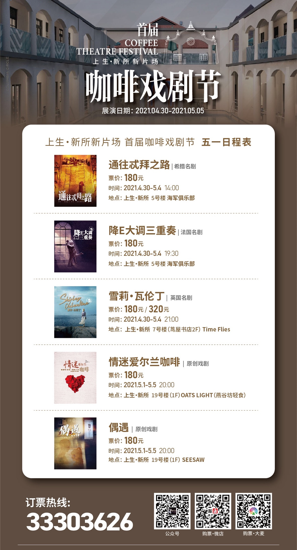 此次咖啡戲劇節(jié)恰逢五一長假,屆時,上生·新所內的蔦屋書店二樓咖啡酒廊、燕谷坊、SEESAW咖啡館等和海軍俱樂部內,將從下午到晚上輪番上演5部咖啡戲劇,其中有英國名劇《雪莉·瓦倫丁》、法國名劇《降E大調三重奏》、希臘名劇《通往忒拜之路》、原創(chuàng)咖啡戲劇《情迷愛爾蘭咖啡》和《偶遇》。