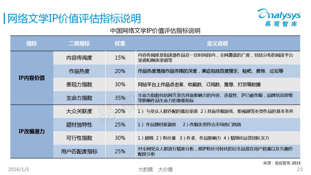 易觀曾于《2015年中國(guó)網(wǎng)絡(luò)文學(xué)IP價(jià)值研究及評(píng)估》報(bào)告中提出8個(gè)評(píng)估指標(biāo),除了站內(nèi)數(shù)據(jù)與站外傳播之外,題材獨(dú)特性與擁有的粉絲量也是其中的關(guān)鍵詞。而這,很可能是免費(fèi)閱讀先天欠缺的東西。