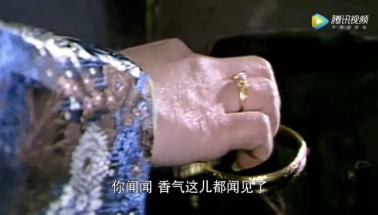 平兒在蘆雪庵吃鹿肉時取下鐲子。來源/87版《紅樓夢》截圖