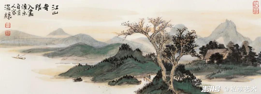 這一幅《江山無限入畫漁樂自有人家》疏密有致,張弛有度,用潑墨淡彩手法作畫,讓遠(yuǎn)山朦朧柔和,與霞光天色渾然一體。平遠(yuǎn)構(gòu)圖之法如同寬銀幕電影鏡頭,由近及遠(yuǎn),層層深入,意境高雅?!芭轳宸ā蓖癸@山石肌理,“米點(diǎn)皴法”妙畫林間的蔥蔥郁郁。