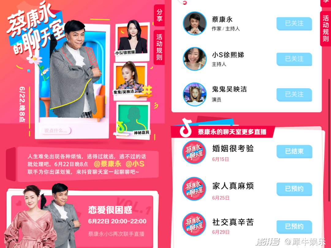 繼羅永浩4月份開啟首檔聊天室直播節(jié)目《老羅和他的朋友們》后,近期蔡康永和小S在抖音實現(xiàn)合體,在全新直播IP《蔡康永的聊天室》里暢聊上述的“婚姻相處哲學(xué)”,引得網(wǎng)友們直呼“是《康熙》回來了嗎?”