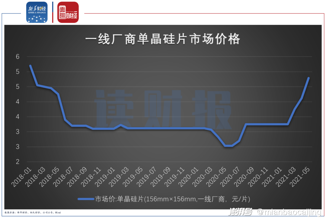 另外,以電池片為主營的愛旭股份,其上游原材料單晶硅片的價(jià)格不斷推高,對(duì)公司未來的利潤將造成較大影響。數(shù)據(jù)顯示,自2020年4月以來,單晶硅片的價(jià)格出現(xiàn)了明顯的上漲。截至2021年5月,一線廠商156mm*156mm單晶硅片的市場價(jià)格升至4.79元/片。