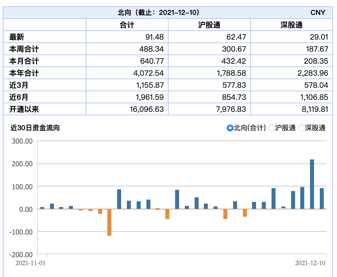 截至收盤,北向資金今日凈流入91.48億元,其中,滬股通凈流入62.47億元,深股通凈流入29.01億元。至此,本周北向資金合計(jì)凈流入488.34億元,創(chuàng)下滬深股通開通以來單周凈流入的新高。