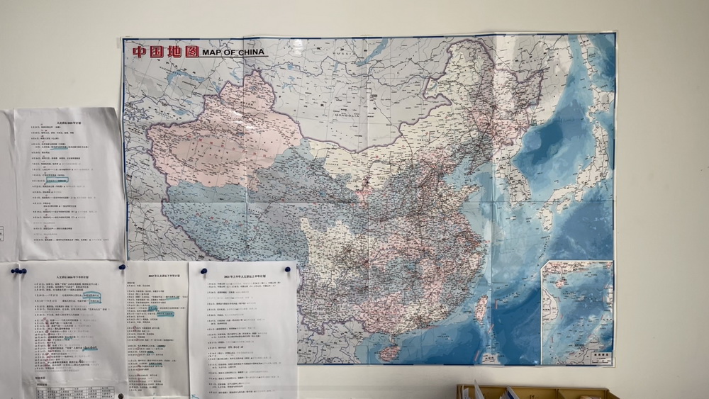 樊陽(yáng)辦公室的墻面上貼著一張中國(guó)地圖,旁邊是近幾年來(lái)的人文講壇安排。