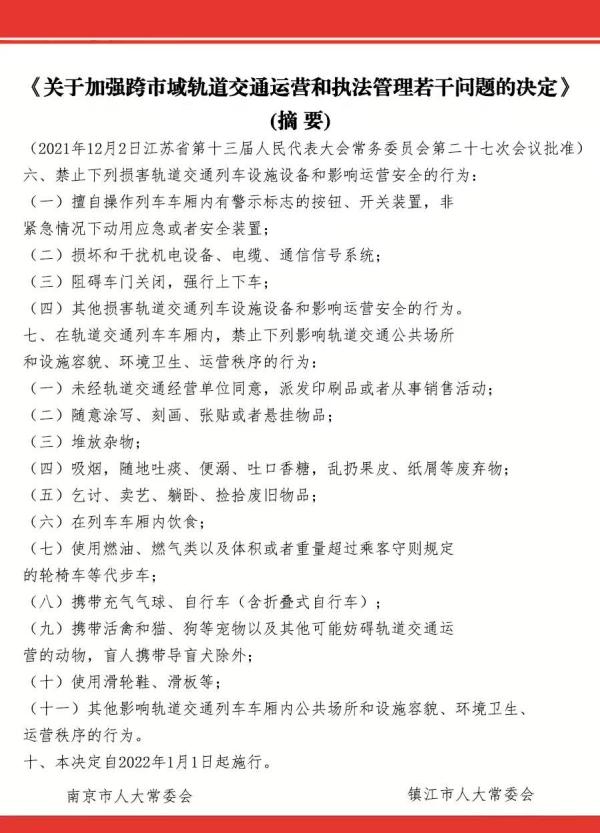 12月17日,澎湃新聞(www.xinlihui.cn)從南京、鎮(zhèn)江兩市人大常委會獲悉,針對上述問題,兩市開展了協(xié)同立法,制定了《關(guān)于加強跨市域軌道交通運營和執(zhí)法管理若干問題的決定》,該《決定》于12月2日獲江蘇省十三屆人大常委會第二十七次會議審查批準(zhǔn),將于2022年1月1日施行。