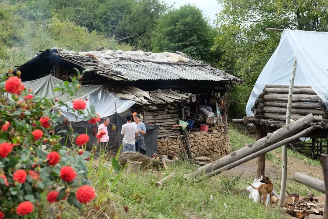 ●我們爬山去拜訪高處的傈僳族村落。當(dāng)?shù)厝丝谥?0分鐘的路程,我們爬了一個(gè)半小時(shí)。攝:伍嬌終于在一個(gè)半小時(shí)的山路后,幾乎是沒(méi)有準(zhǔn)備的,我們眼前出現(xiàn)了大片的草甸和田園,幾聲雞鳴遠(yuǎn)遠(yuǎn)傳來(lái)。再穿過(guò)一片核桃林,就看見(jiàn)幾座木楞屋,門(mén)前簇?fù)碇髤驳募t色大麗花,枝葉繁茂的老樹(shù)下幾位老人正在洗菜,山泉順著水管汩汩流淌出來(lái)。
