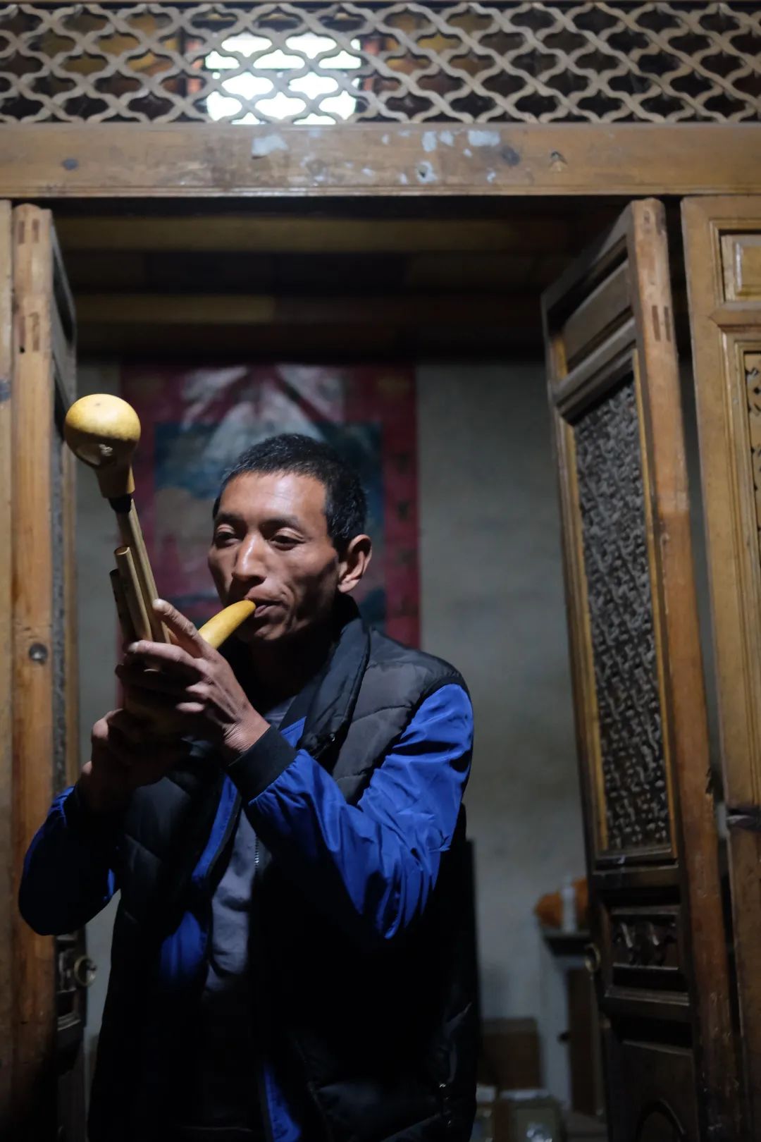 晚上建文把族里的長(zhǎng)者和年輕人都請(qǐng)來(lái)和我們聊天,講述傈僳族的歷史文化和生活日常,大家互相補(bǔ)充,印證彼此的記憶。興到濃時(shí),樂(lè)師吹起蘆笙,帶領(lǐng)年輕小伙子在院子中間打跳起來(lái),頓時(shí)歡聲笑語(yǔ)飛滿全場(chǎng)。