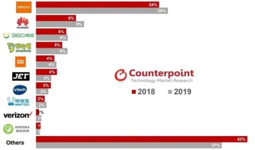 根據(jù)Counterpoint 公布的 2019 年全球兒童手表市場占有率顯示,中國的兒童智能手表占有全球市場的 62%,其中小天才手表( imoo)占全球市場 26%,在國內(nèi)市場,其市占率第一,超過國內(nèi)其他兒童手表市場之和。截止至2019年3月,小天才電話手表國內(nèi)共累積出貨超2000萬臺。