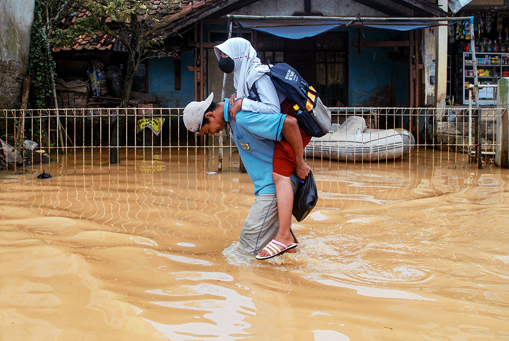 當(dāng)?shù)貢r(shí)間2022年3月15日,印尼萬隆,一名男子將女兒背在背上。