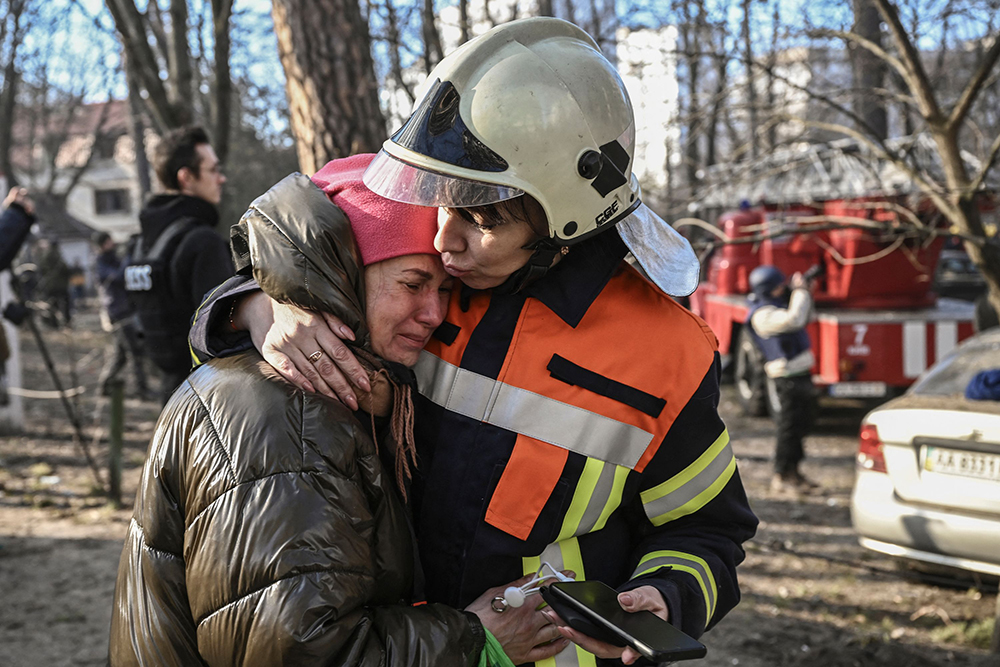 2022年3月15日,烏克蘭基輔,一名婦女從燃燒的公寓樓中逃離。