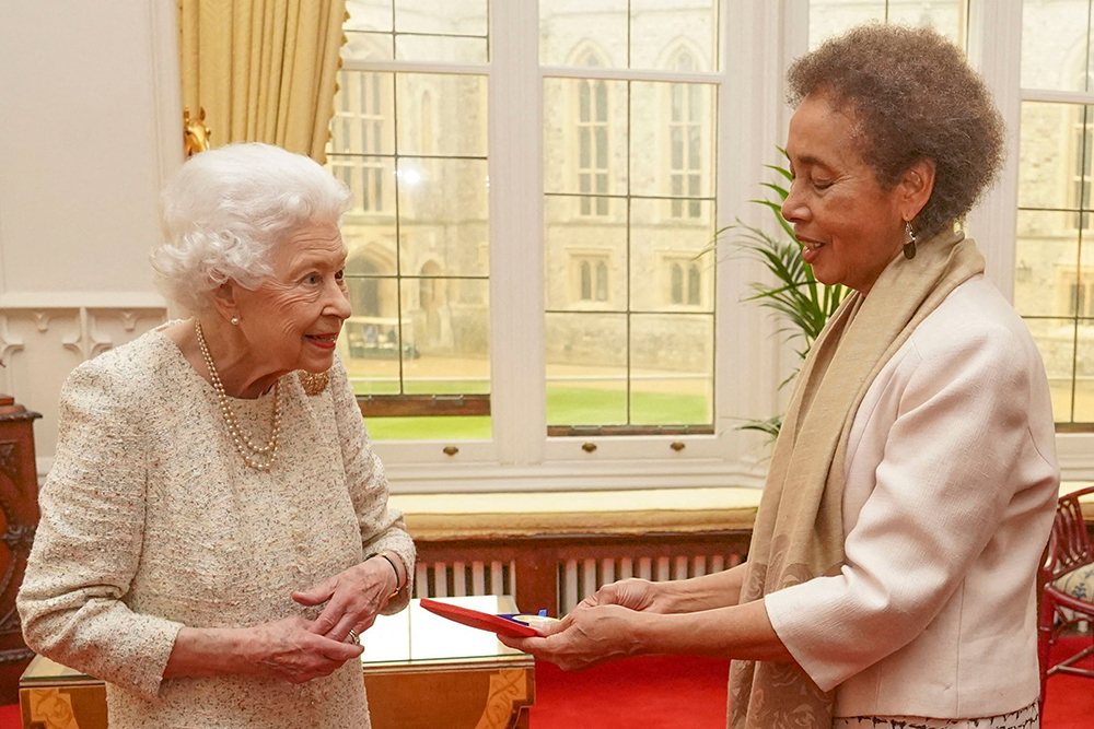 當?shù)貢r間2022年3月16日,英國溫莎城堡,英國女王伊麗莎白二世向英國現(xiàn)代女詩人格麗斯·尼柯爾斯頒發(fā)英國女王詩歌金質獎章。