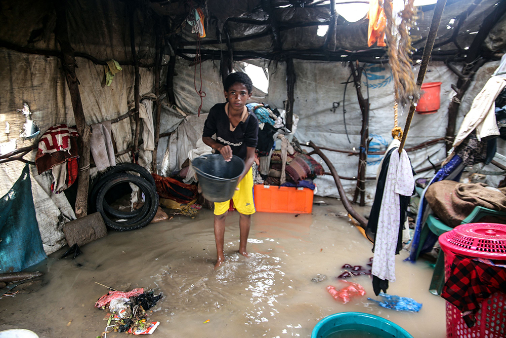 當?shù)貢r間2022年3月16日,也門西部荷臺達省,當?shù)仉y民營遭遇暴雨后積水嚴重。