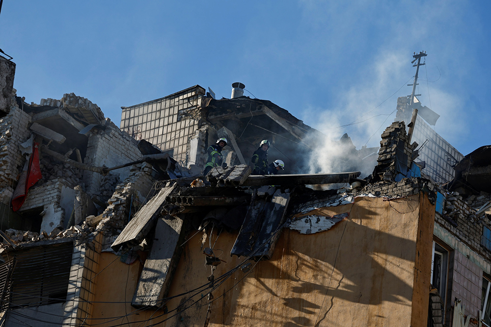 當?shù)貢r間2022年3月16日,烏克蘭基輔,救援人員在被炮擊的公寓樓頂上開展搜救工作。
