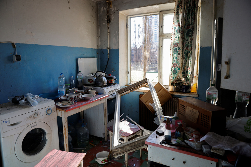 當?shù)貢r間2022年3月16日,烏克蘭基輔,一間被炮擊受損的廚房。