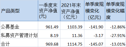 不過,從最新公布的一季報(bào)內(nèi)容來看,截至3月末,葛蘭管理的5只公募基金合計(jì)規(guī)模降至961.49億元,較2021年末的1103.39億元,單季度縮水145.07億元,環(huán)比降幅達(dá)12.86%;而前一季度葛蘭管理公募基金規(guī)模正是因?yàn)樵黾?33.38億元,才會(huì)最終突破千億大關(guān)。