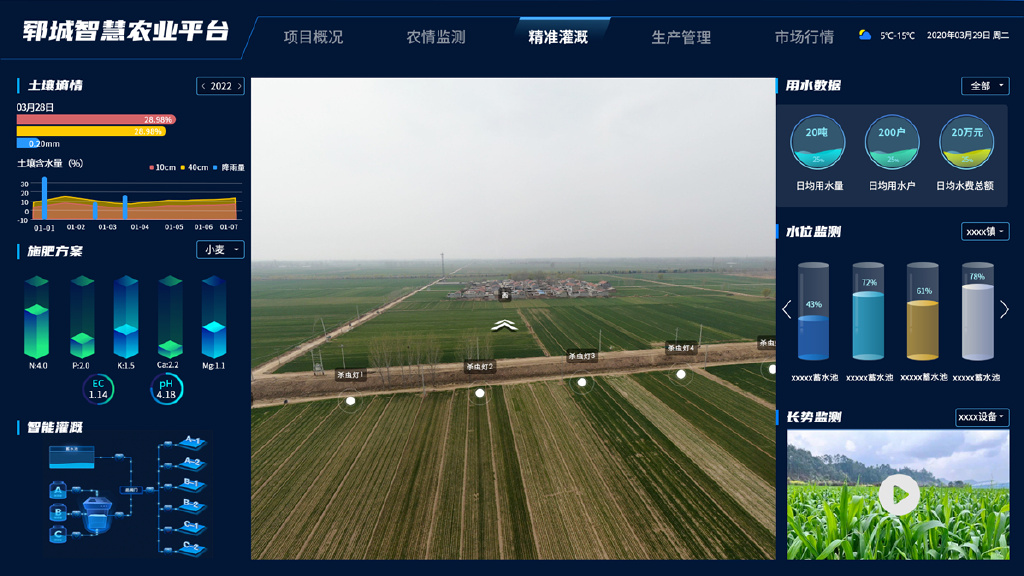 “智慧農(nóng)業(yè)”平臺包含智能灌溉系統(tǒng),可對灌溉用水總量進(jìn)行監(jiān)測預(yù)警,當(dāng)水位下降到警戒值且天氣預(yù)報(bào)缺少降雨時(shí)對農(nóng)戶灌溉用水量進(jìn)行流量管控提示;實(shí)時(shí)統(tǒng)計(jì)日均用水戶數(shù)、每戶用水量及用水總量;實(shí)時(shí)監(jiān)控灌溉用水質(zhì)量。