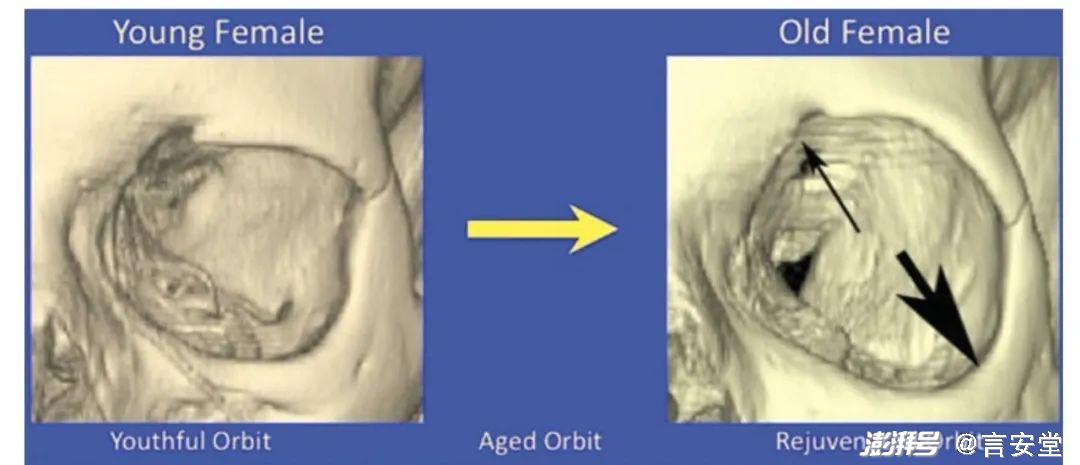 在年輕時(shí),此四邊形近似于圓形或矩形,隨著年齡增大,眶上緣內(nèi)1/3及眶下緣外1/3的骨吸收,使得之前較水平的眶上、下緣都變?yōu)閮?nèi)上和外下走向,使原本接近圓形或矩形的眼眶逐漸演變?yōu)榱庑巍?/p>