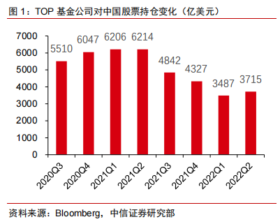 根據(jù)中信證券統(tǒng)計分析,2022年二季度樣本基金公司對中國股票前20大重倉持股規(guī)模合計為3715億美元,較2022年一季度環(huán)比提升6.5%。