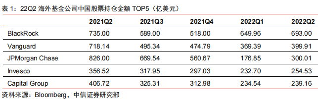 分機構(gòu)來看,二季度BlackRock、Vanguard、Invesco、Capital Group對中國股票持倉規(guī)模分別上升6.6%、8.3%、9.4%、2%至693億美元、399.91億美元、254.53億美元、239.16億美元。