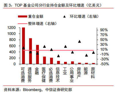 二級行業(yè)層面上,大消費板塊普遍獲增持,汽車與汽車零部件、耐用消費品與服裝、消費者服務(wù)、零售業(yè)板塊重倉持股金額分別增長42.5%、32.1%、13.5%、11.2%至187.3億美元、146.2億美元、143.8億美元、918.1億美元。