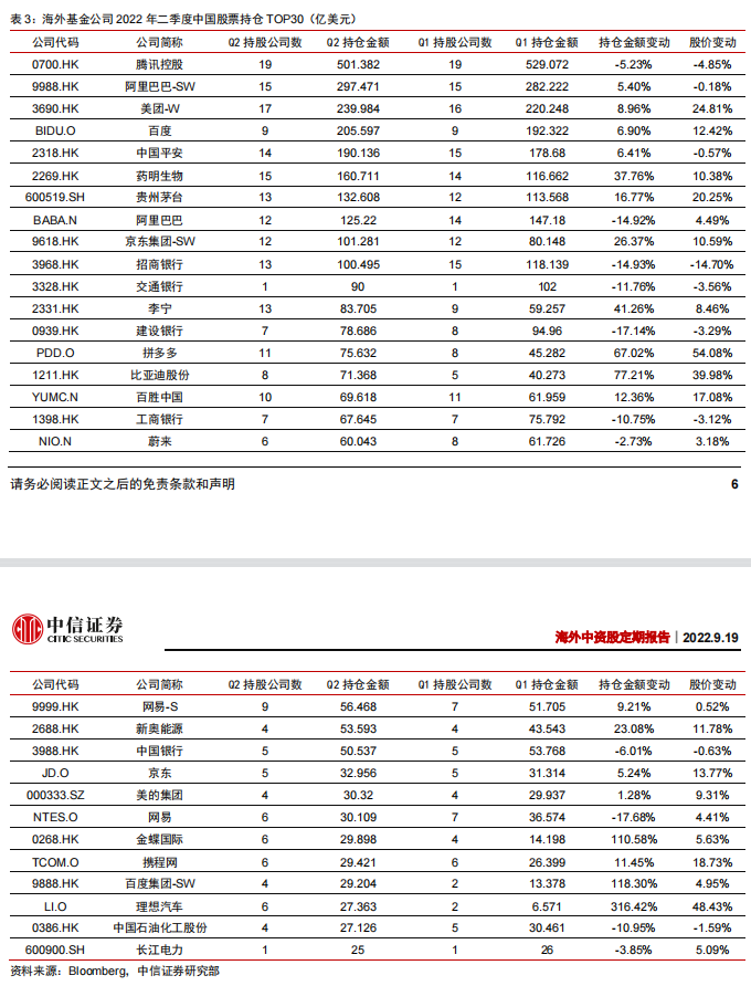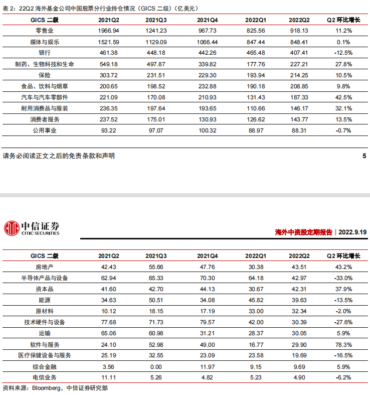 據(jù)中信證券9月19日發(fā)布的研報,截至9月中下旬,2022年第二季度,海外主要基金對中資股重倉持股環(huán)比提升6.5%。