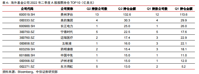 中信證券統(tǒng)計了海外主要基金2022年二季度重倉的前十大A股公司,共有9家為2022年一季度重倉公司。消費公司仍然占據(jù)主導,在前十中占據(jù)五家。主要集中于白酒、家電。五家公司合計重倉持股金額達208.9億美元。其中,白酒龍頭貴州茅臺(600519.SH)獲海外基金大幅增持19億美元。