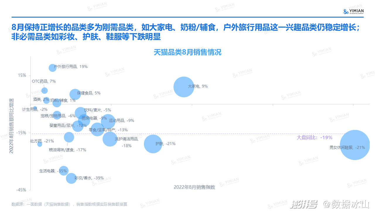 從品類大盤來看:8月保持正增長的品類多為剛需品類;非必需品類如彩妝、護(hù)膚、鞋服等下跌明顯。