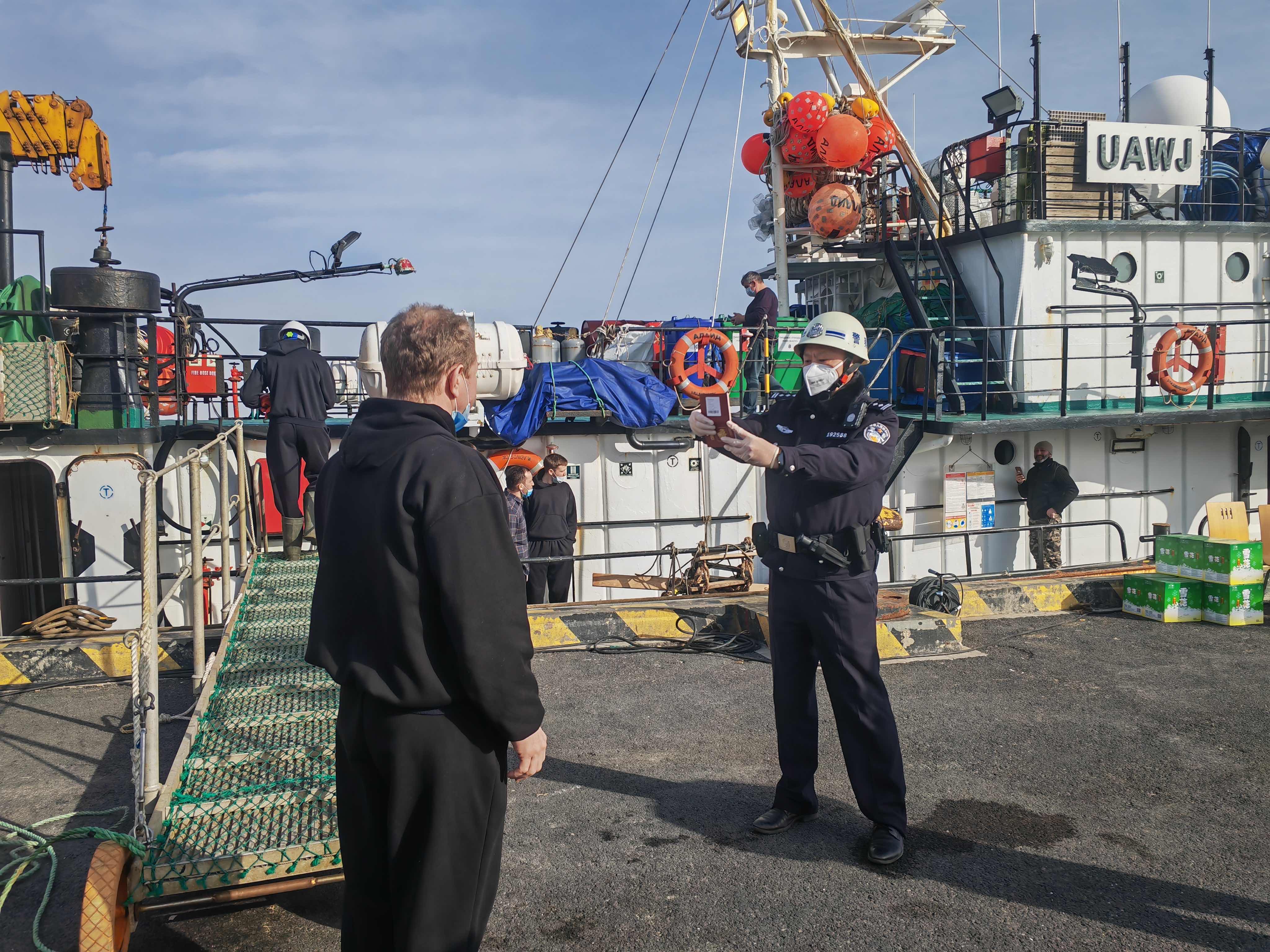 上海移民管理警察在崇明口岸登輪辦理邊檢查驗手續(xù)。