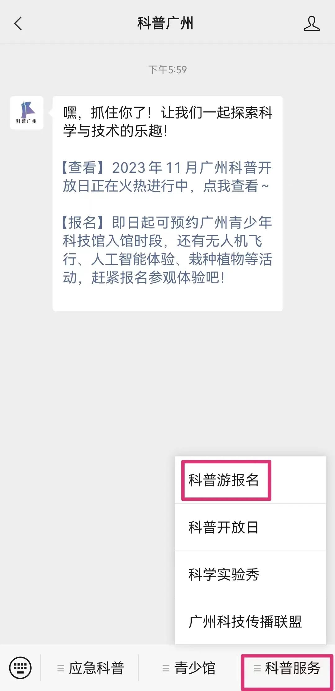 關(guān)注微信公眾號(hào)“科普廣州”,點(diǎn)擊菜單欄“科普服務(wù)”-“科普游報(bào)名”或者在公眾號(hào)回復(fù)“科普游”按提示登錄報(bào)名系統(tǒng)進(jìn)行報(bào)名。