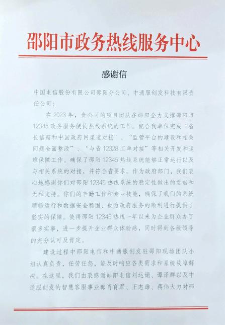 2023年12月20日,中國(guó)電信湖南邵陽(yáng)分公司收到了邵陽(yáng)市政務(wù)熱線服務(wù)中心送來(lái)的感謝信,感謝中國(guó)電信湖南邵陽(yáng)分公司現(xiàn)場(chǎng)團(tuán)隊(duì)支撐了邵陽(yáng)市12345政務(wù)服務(wù)便民熱線系統(tǒng)的工作,確保邵陽(yáng)12345熱線系統(tǒng)正常運(yùn)行以及完成與相關(guān)系統(tǒng)的對(duì)接。