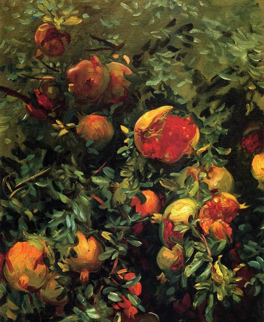 石榴 約翰·辛格·薩金特/繪植物也如此:一株西來(lái)的植物沿絲綢之路去向東方,在東方扎下了根,慢慢地,與本土特征融合了,變成了本土植物,加入了東方植物譜系。偶爾回首,它在日益復(fù)雜而模糊的血統(tǒng)中辨認(rèn)出自己的起源、自己的母土:波斯、阿拉伯、印度、地中海、非洲……西來(lái)的葡萄、西來(lái)的西瓜、西來(lái)的石榴、西來(lái)的無(wú)花果、西來(lái)的甜瓜、西來(lái)的阿月渾子、西來(lái)的沒藥、西來(lái)的郁金香……尤其是西來(lái)的石榴,與葡萄、無(wú)花果一道,被譽(yù)為“絲綢之路三大名果”。