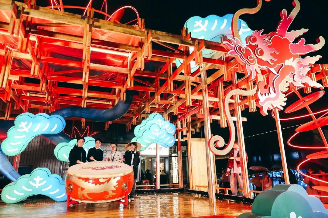 隨著隆隆鼓聲和現(xiàn)場(chǎng)喝彩聲,煥裝后的龍華戲臺(tái)上,以鋼結(jié)構(gòu)為軀干、亞克力材質(zhì)為龍身的藝術(shù)裝置被燈光點(diǎn)亮,藤蔓變形歸納成更加抽象的形態(tài),演繹出獨(dú)一無二的戲臺(tái)龍,使龍這一古老的圖騰煥發(fā)出全新的生命力,也標(biāo)志著“妙會(huì)龍舞 福啟新歲”新春游園會(huì)正式拉開帷幕。