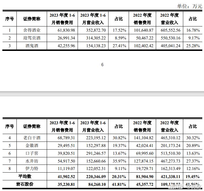 針對(duì)銷售費(fèi)過高質(zhì)疑,上海貴酒認(rèn)為具有合理性。推廣宣傳持續(xù)加強(qiáng),推動(dòng)了銷售費(fèi)增長(zhǎng);企業(yè)堅(jiān)持長(zhǎng)期主義,深耕主業(yè),看重品牌力建設(shè),并非短期盈利水平。并對(duì)比舍得酒業(yè)、迎駕貢酒、酒鬼酒、老白干酒、金徽酒、口子窖、水井坊、伊力特等8家上市酒企,稱2022年、2023上半年銷售費(fèi)用率為41.56%和41.81%,“基本持平?!?/p>