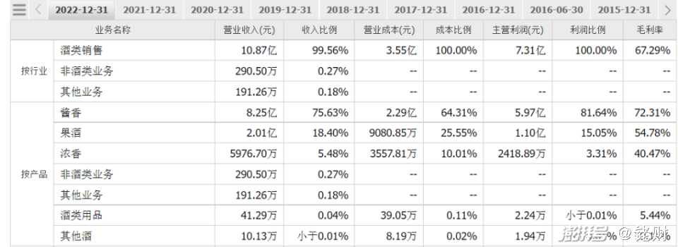 若按產(chǎn)品類型劃分,醬香產(chǎn)品是妥妥營收支柱。以2022年為例,為上海貴酒貢獻(xiàn)8.25億元營收,收入占比75.63%;緊隨其后的果酒,則貢獻(xiàn)2.01億元營收,占比18.4%。