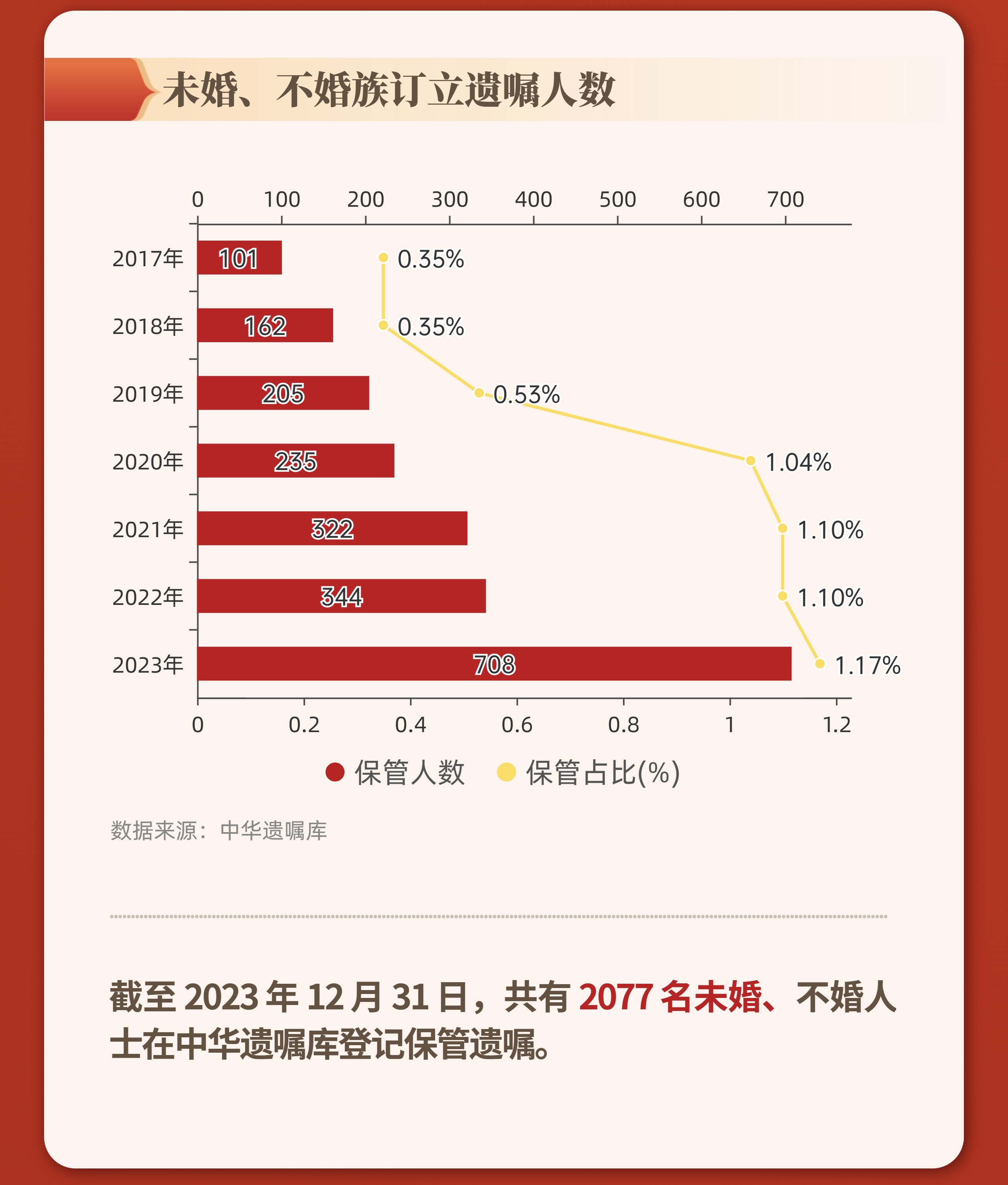 截至2023年12月31日,共有2077名未婚、不婚人士在中華遺囑庫登記保管遺囑。這一數(shù)量相較于2017年的101人,翻了19倍之多。而2023年,這一群體訂立遺囑人數(shù)為704人,超過上一年的兩倍。