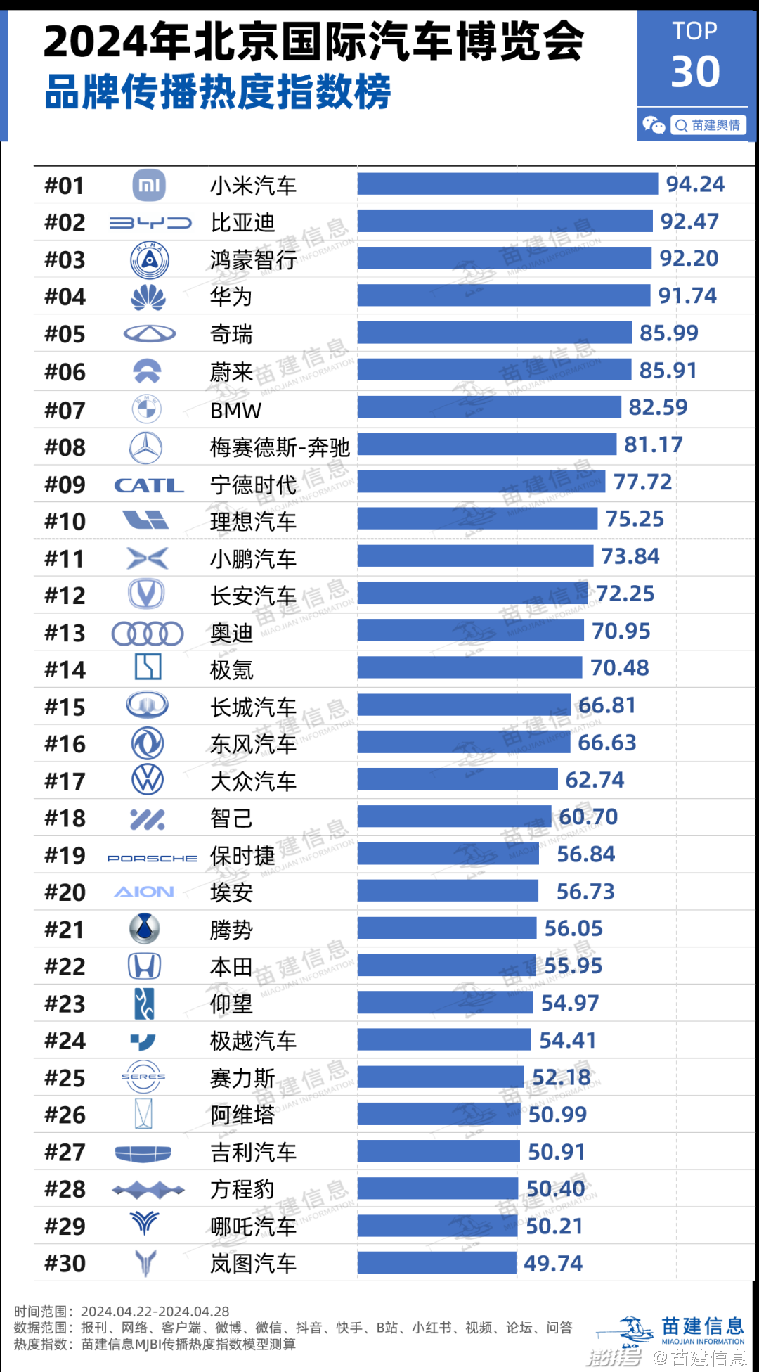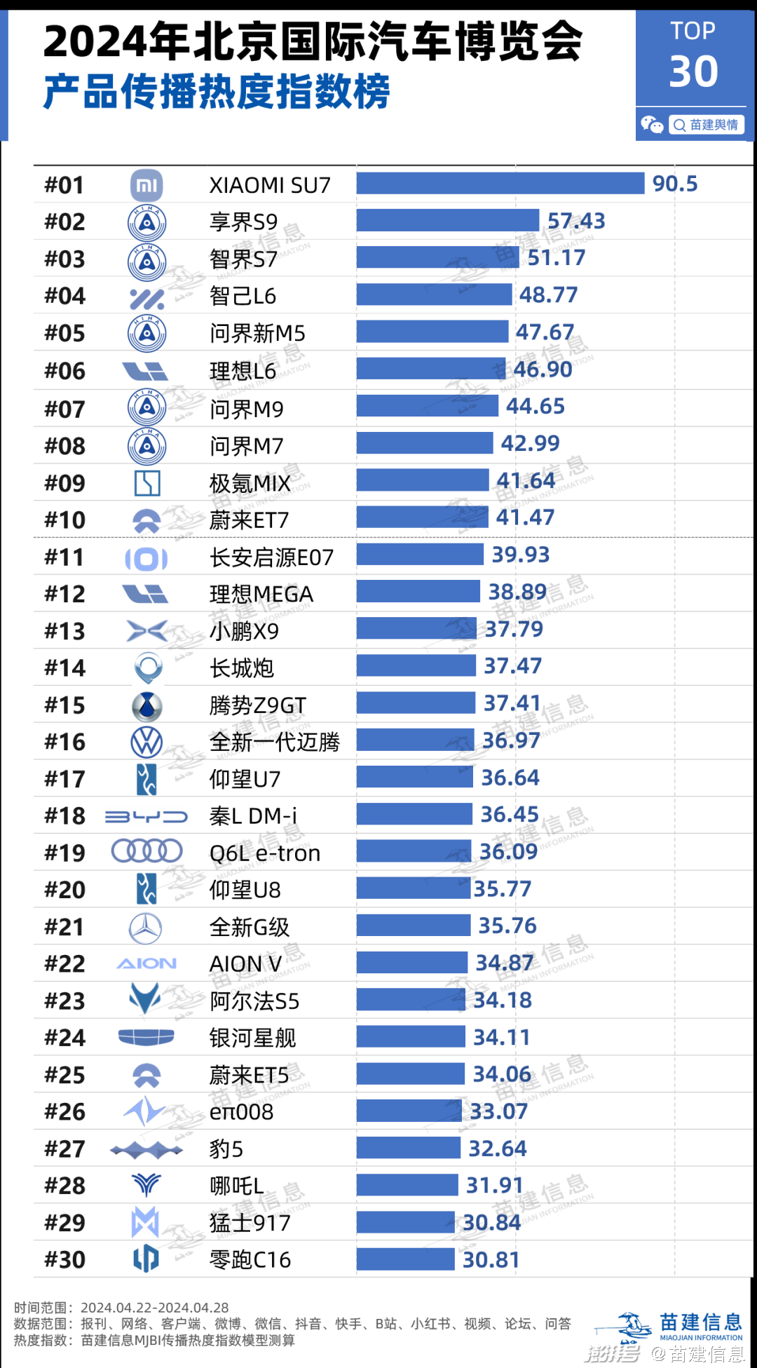 根據(jù)苗建信息傳播影響力指數(shù)(MJBI指數(shù))模型(注1),對參展的100余家(注2)汽車品牌及其旗下產(chǎn)品進(jìn)行了傳播熱度指數(shù)排名。