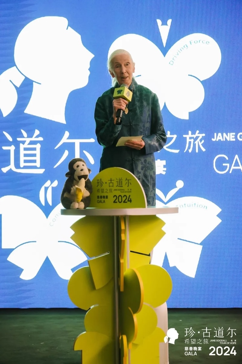 珍·古道爾在北京舉行的慈善晚宴上,站在椅子上完成了40多分鐘的演講。