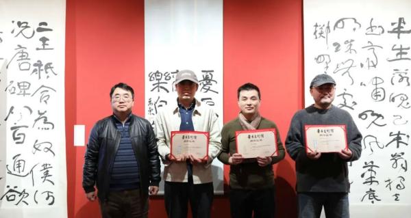 三位參展青年書法家與海派藝術(shù)館執(zhí)行館長(zhǎng)張建華(左1)
