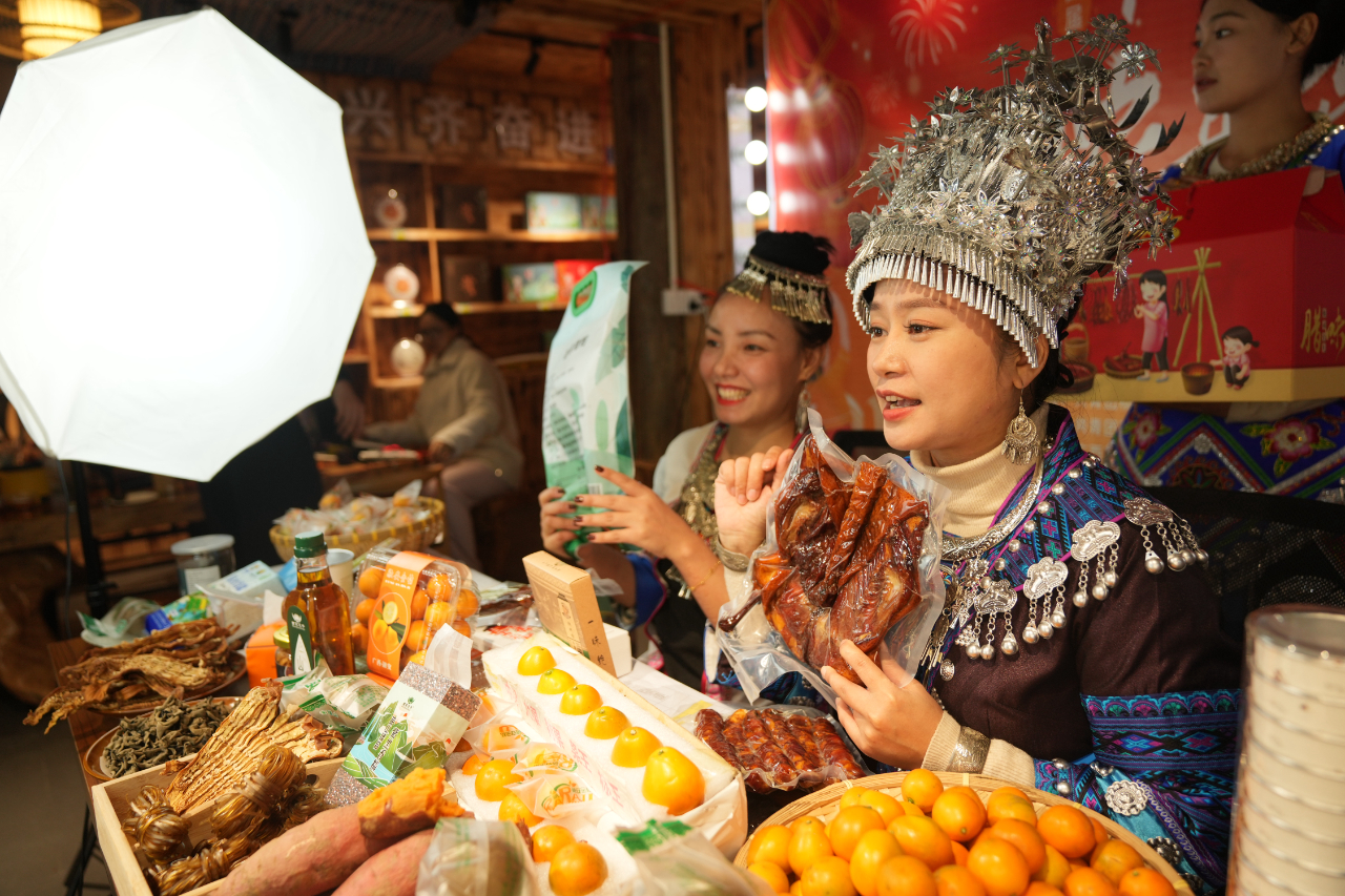在廣西柳州市融水苗族自治縣融水鎮(zhèn)夢嗚苗寨,一家網(wǎng)絡直播室的主播直播銷售農(nóng)家臘鴨。(圖片由CNSPHOTO提供)
