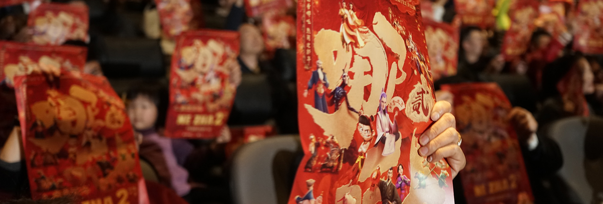 2月8日,人們在美國洛杉磯舉行的《哪吒之魔童鬧?!繁泵朗子扯Y上舉起電影海報(bào)。 新華社 圖