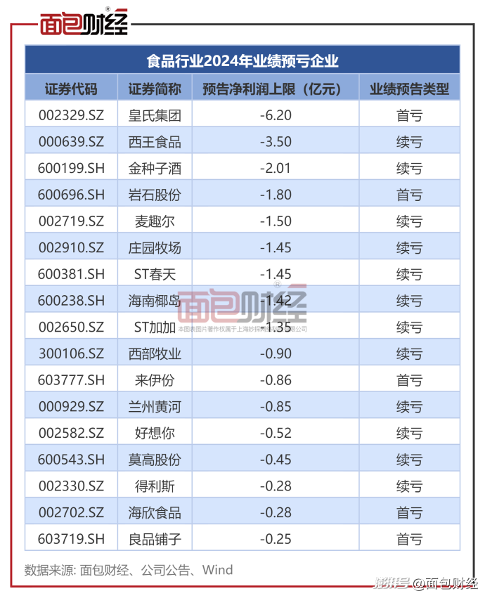 皇氏集團(tuán)預(yù)告2024年凈利潤上限虧損達(dá)到6.2億元。此外,西王食品、金種子酒、巖石股份等8家公司虧損或超1億元。