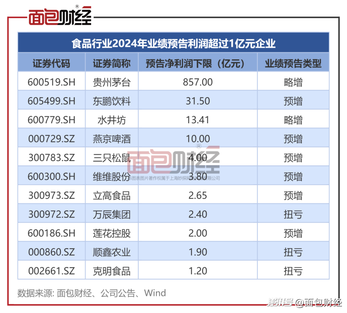 貴州茅臺、東鵬飲料、水井坊、燕京啤酒預(yù)告凈利潤下限達(dá)到或超過10億元。此外,三只松鼠、維維股份等7家企業(yè)預(yù)告凈利潤下限超過1億元。