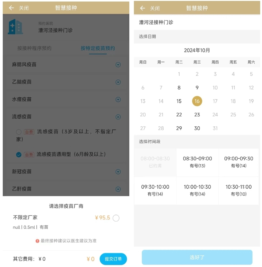第三步:選擇【流感疫苗通用型(6月齡及以上)】,并選擇預(yù)約日期及時(shí)間。